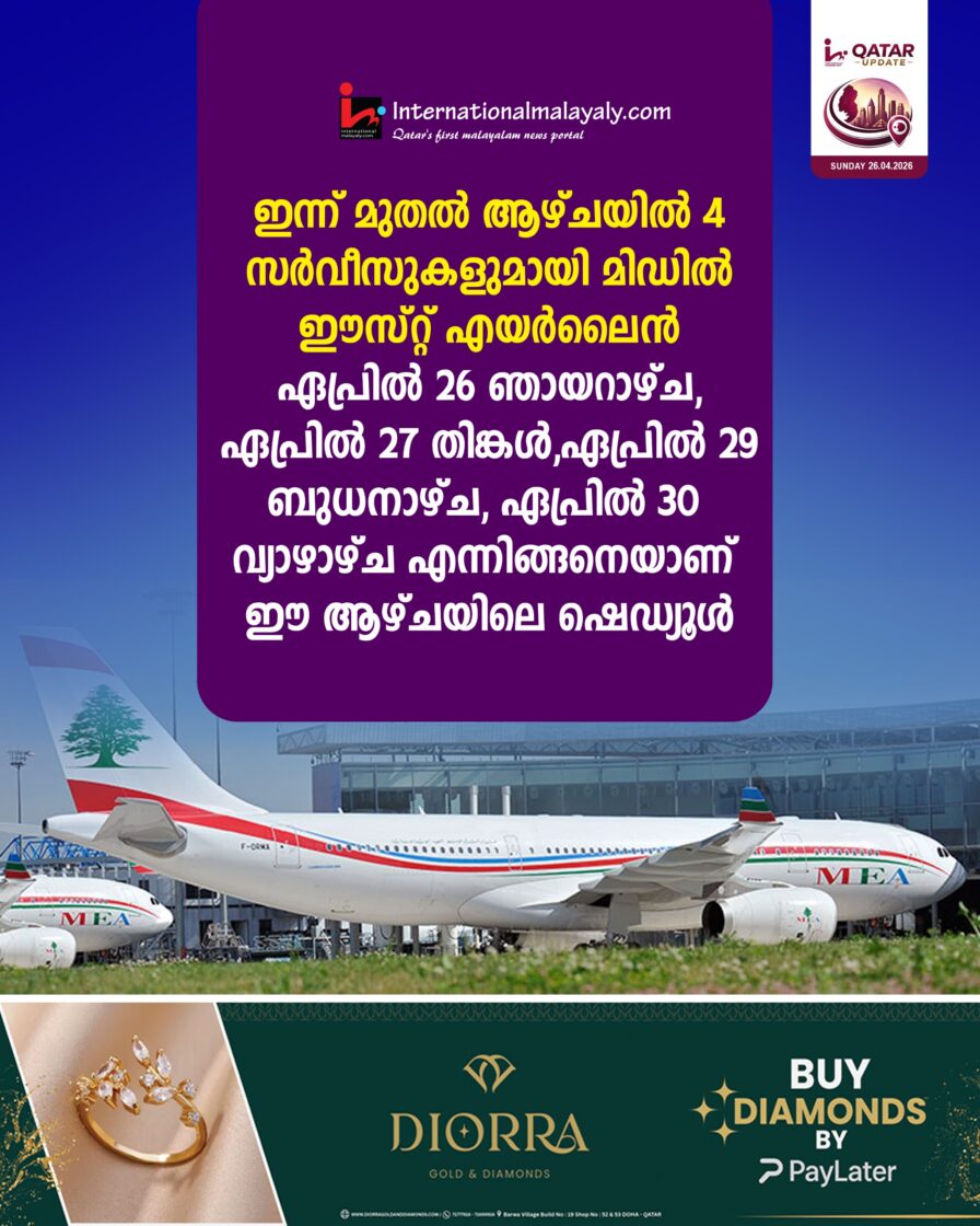 ഇന്ന് മുതല് ആഴ്ചയില് 4 സര്വീസുകളുമായി മിഡില് ഈസ്റ്റ് എയര്ലൈന് . ഏപ്രില് 26 ഞായര്, ഏപ്രില് 27 തിങ്കള്,ഏപ്രില് 29 ബുധന്, ഏപ്രില് 30 വ്യാഴം എന്നിങ്ങനെയാണ് ഈ ആഴ്ചയിലെ ഷെഡ്യൂള്