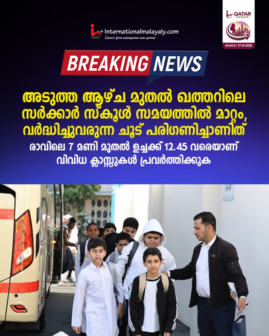 അടുത്ത ആഴ്ച മുതല് ഖത്തറിലെ സര്ക്കാര് സ്കൂള് സമയത്തില് മാറ്റം, വര്ദ്ധിച്ചുവരുന്ന ചൂട് പരിഗണിച്ചാണിത്, രാവിലെ 7 മണി മുതല് ഉച്ചക്ക് 12.45 വരെയാണ് വിവിധ ക്ളാസുകള് പ്രവര്ത്തിക്കുക