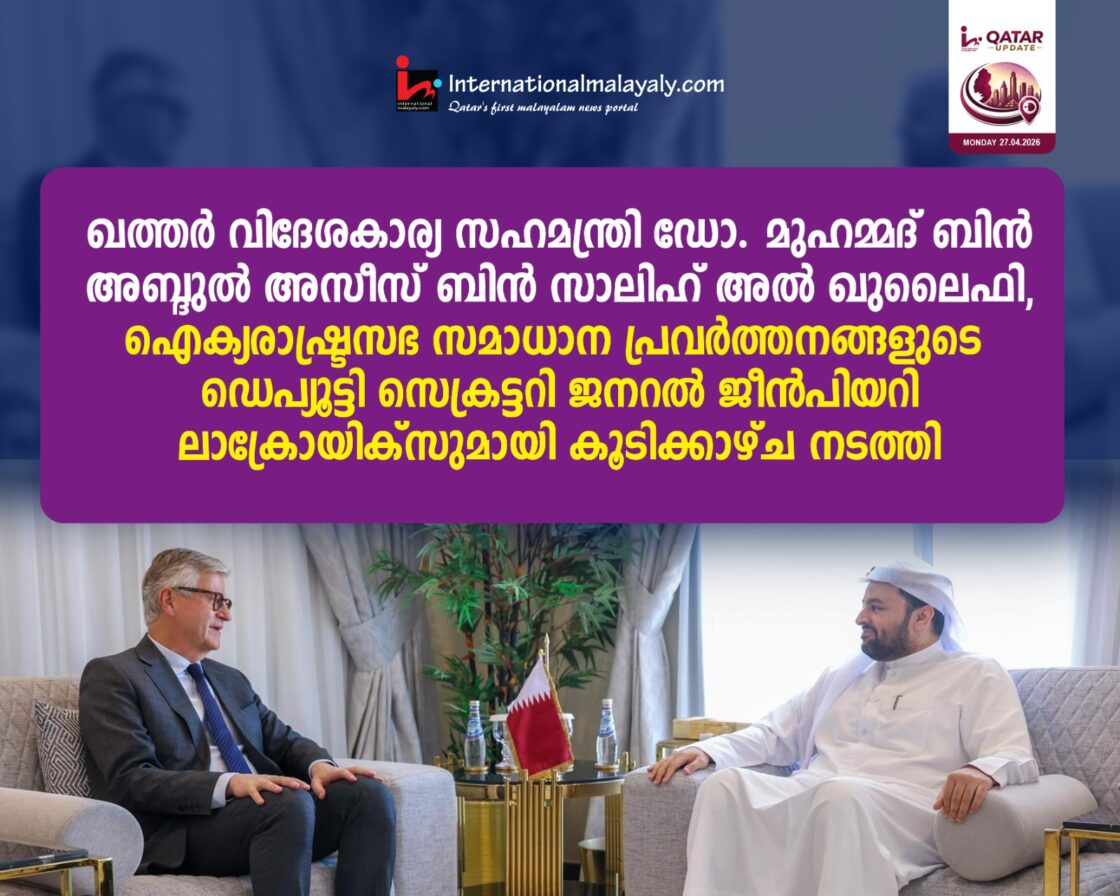 ഖത്തര് വിദേശകാര്യ സഹമന്ത്രി ഐക്യരാഷ്ട്രസഭ സമാധാന പ്രവര്ത്തനങ്ങളുടെ ഡെപ്യൂട്ടി സെക്രട്ടറി ജനറല് ജീന്-പിയറി ലാക്രോയിക്സുമായി കൂടിക്കാഴ്ച നടത്തി