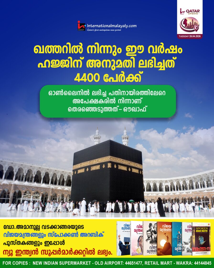 ഖത്തറില് നിന്നും ഈ വര്ഷം ഹജ്ജിന് അനുമതി ലഭിച്ചത് 4400 പേര്ക്ക്, ഓണ്ലൈനില് ലഭിച്ച പതിനായിരത്തിലേറെ അപേക്ഷകരില് നിന്നാണ് തെരഞ്ഞെടുത്തത്- ഔഖാഫ്