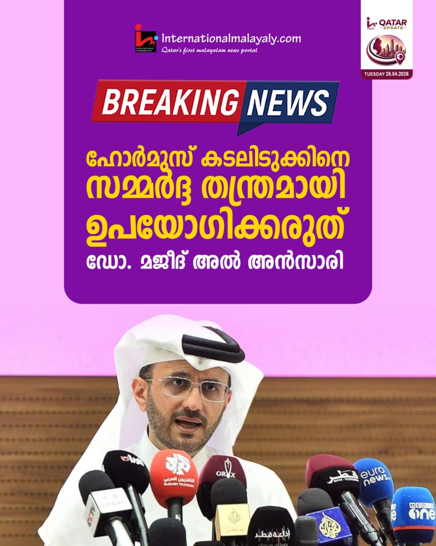 ഹോര്മുസ് കടലിടുക്കില് നാവിഗേഷന് തടയുന്നത് ന്യായീകരിക്കാനാവില്ലെന്നും ഹോര്മുസ് കടലിടുക്കിനെ ഒരിക്കലും സമ്മര്ദ്ദ ഉപകരണമായി ഉപയോഗിക്കരുതെന്നും ഖത്തര് പ്രധാനമന്ത്രിയുടെ ഉപദേഷ്ടാവും വിദേശകാര്യ മന്ത്രാലയ വക്താവുമായ ഡോ. മാജിദ് ബിന് മുഹമ്മദ് അല് അന്സാരി ഇന്ന് നടത്തിയ വാര്ത്ത സമ്മേളനത്തില് വ്യക്തമാക്കി