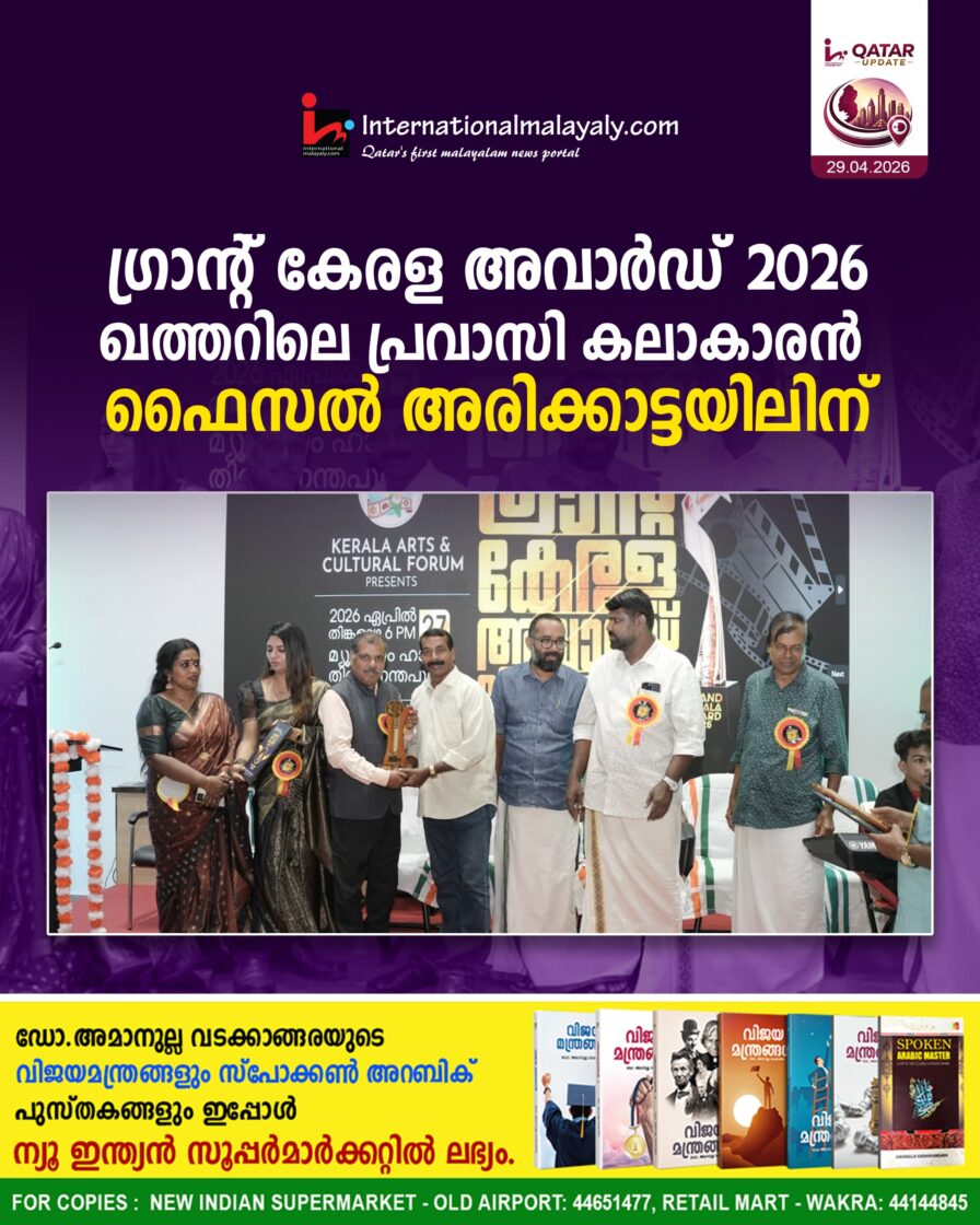 ഗ്രാന്റ് കേരള അവാര്ഡ് 2026 ഖത്തറിലെ പ്രവാസി കലാകാരന് ഫൈസല് അരിക്കാട്ടയിലിന്