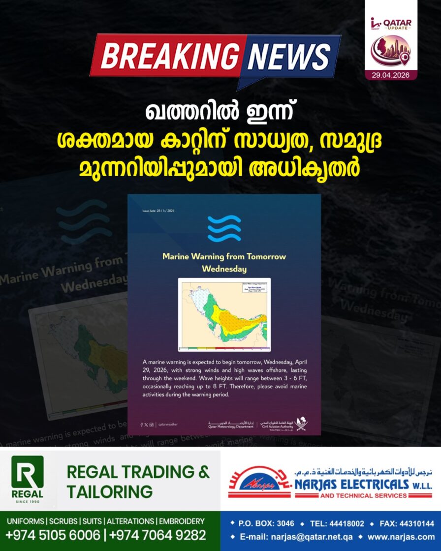 ഏപ്രില് 29 ബുധനാഴ്ച മുതല് തീരത്ത് ശക്തമായ കാറ്റും ഉയര്ന്ന തിരമാലകളും ഉണ്ടാകുമെന്ന് പ്രതീക്ഷിക്കുന്നതിനാല് ഖത്തര് കാലാവസ്ഥാ വകുപ്പ് സമുദ്ര മുന്നറിയിപ്പ് നല്കി.