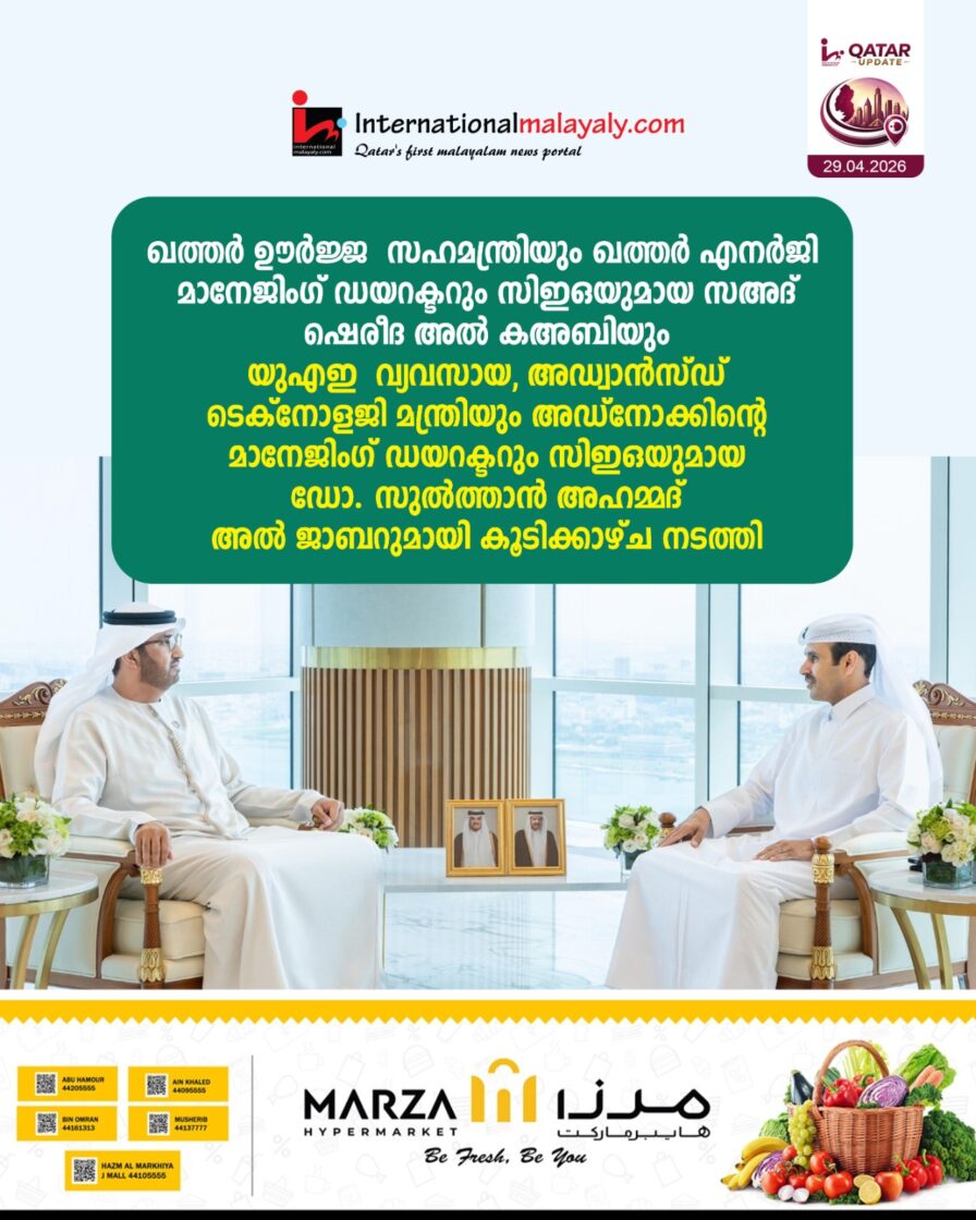 ഖത്തര് ഊര്ജ്ജ സഹമന്ത്രിയും ഖത്തര് എനര്ജി മാനേജിംഗ് ഡയറക്ടറും സിഇഒയുമായ സഅദ് ഷെരീദ അല് കഅബിയും യുഎഇ വ്യവസായ, അഡ്വാന്സ്ഡ് ടെക്നോളജി മന്ത്രിയും അഡ്നോക്കിന്റെ മാനേജിംഗ് ഡയറക്ടറും സിഇഒയുമായ ഡോ. സുല്ത്താന് അഹമ്മദ് അല് ജാബറുമായി കൂടിക്കാഴ്ച നടത്തി.
