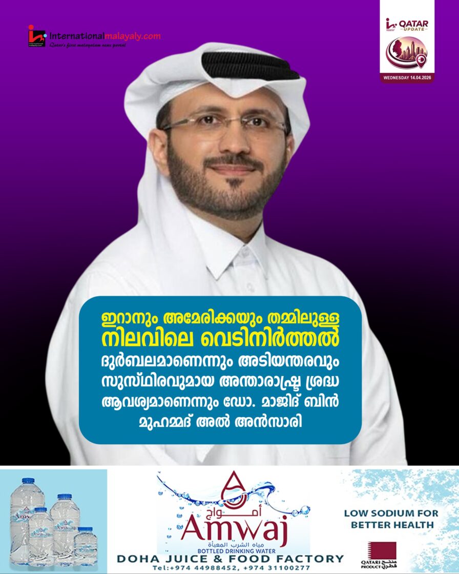 ഇറാനും അമേരിക്കയും തമ്മിലുള്ള നിലവിലെ വെടിനിര്ത്തല് ദുര്ബലമാണെന്നും അടിയന്തരവും സുസ്ഥിരവുമായ അന്താരാഷ്ട്ര ശ്രദ്ധ ആവശ്യമാണെന്നും പ്രധാനമന്ത്രിയുടെ ഉപദേഷ്ടാവും വിദേശകാര്യ മന്ത്രാലയത്തിന്റെ ഔദ്യോഗിക വക്താവുമായ ഡോ. മാജിദ് ബിന് മുഹമ്മദ് അല് അന്സാരി ഊന്നിപ്പറഞ്ഞു.